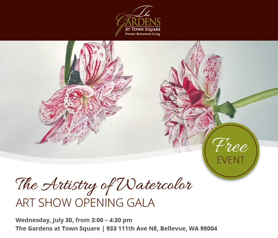 Join us for the opening of our newest show. This exhibition features a sample of work of invited artist from the Northwest Watercolor Society, which showcases the mastery and versatility of the watercolor medium by demonstrating a range of different techniques and approaches to using water-based pigment. Enjoy a selection of hors d’oeuvres and refreshments as you view this diverse collection. Complimentary valet parking will be provided for your convenience.