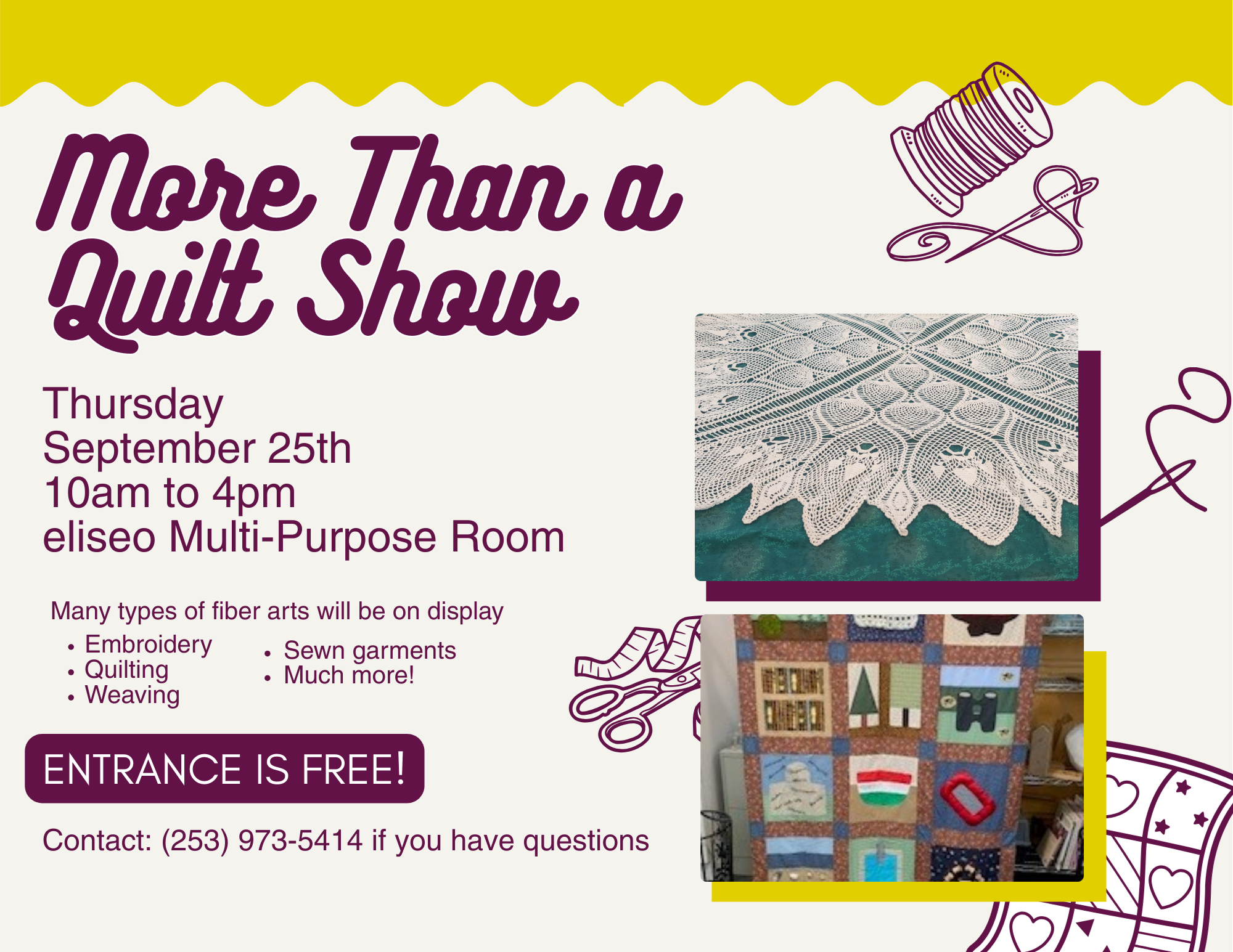 eliseo 1305 N. Highlands Parkway, Tacoma, WA, United StatesDiscover the artistry, color, and craftsmanship of More Than a Quilt Show, presented by Common Threads at eliseo. This resident-led showcase brings together a stunning variety of fiber arts, including:More