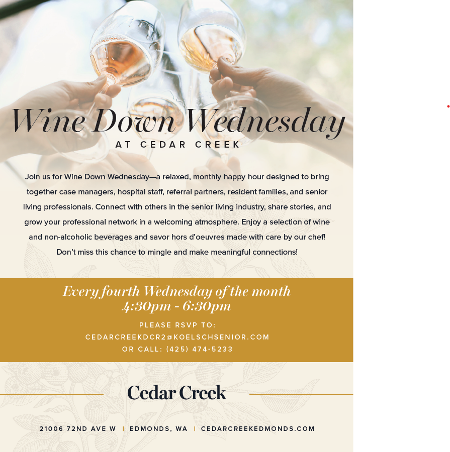 Cedar Creek Memory Care 21006 72nd Ave W, Edmonds, WA, United States🍷 Exquisite Wines: Savor hand-poured selections by Jeff Boyer of Jeff UnCorked, each glass telling a unique story. 📸 Free Headshots: Capture the moment with professional photos by James RizmanMore