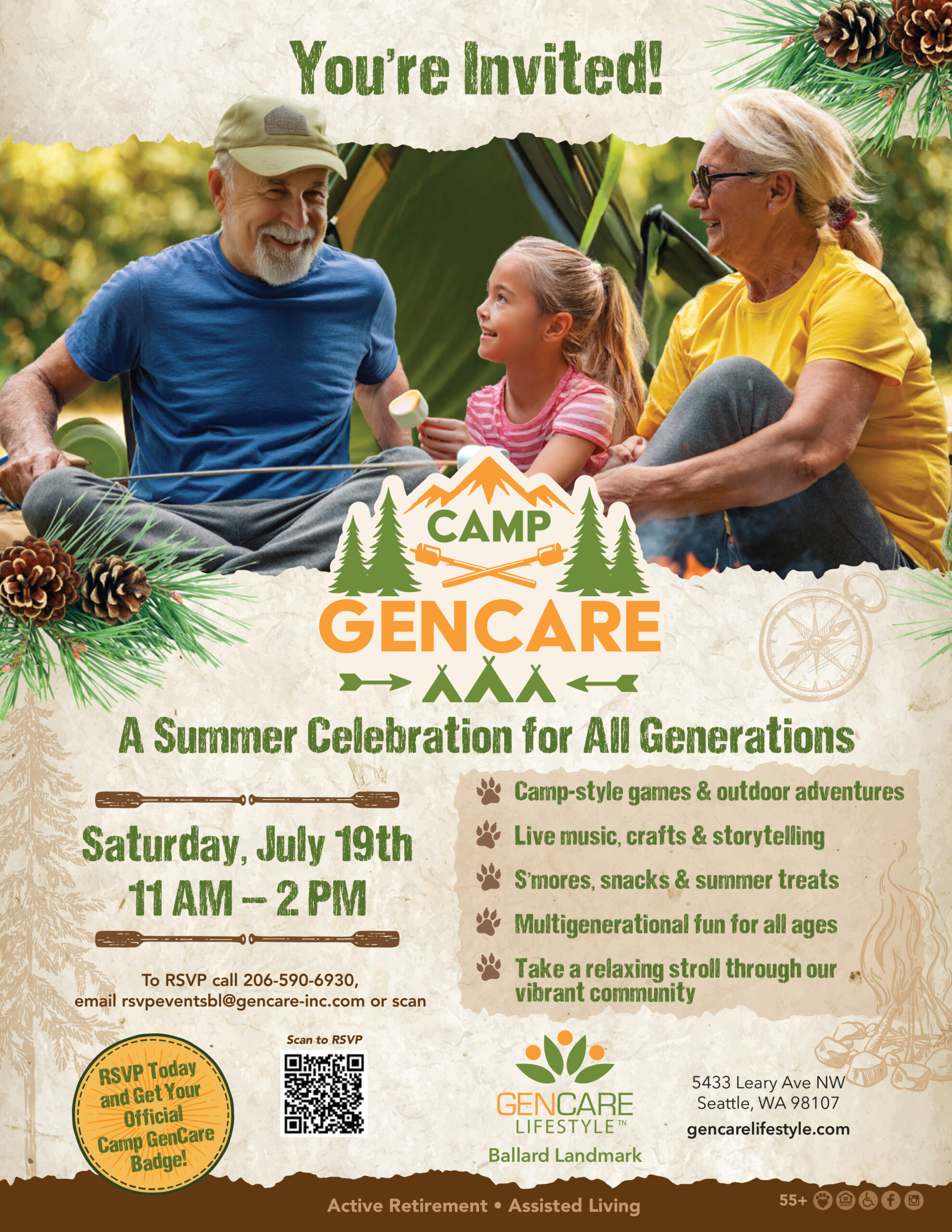 Join us for an afternoon of multigenerational fun! Invite the whole family to experience Whole Life Living at Ballard Landmark. There will be delicious food prepared by our culinary team, games and crafts, and an open house for you to explore all that our community has to offer. RSVP today and get your official Camp GenCare badge!