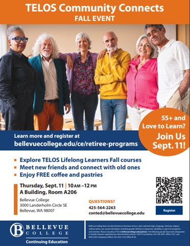What: Bellevue College Continuing Education 3rd Annual TELOS Community Connects Fall Event Who: 55+ and love to learn? Join Bellevue College Continuing Education to learn about our TELOS Lifelong Learners (55+) community, explore Fall courses, meet new friends and connect with old ones. Enjoy FREE coffee and pastries. When: Thursday, September 11 from 10AM-12PM Where:More