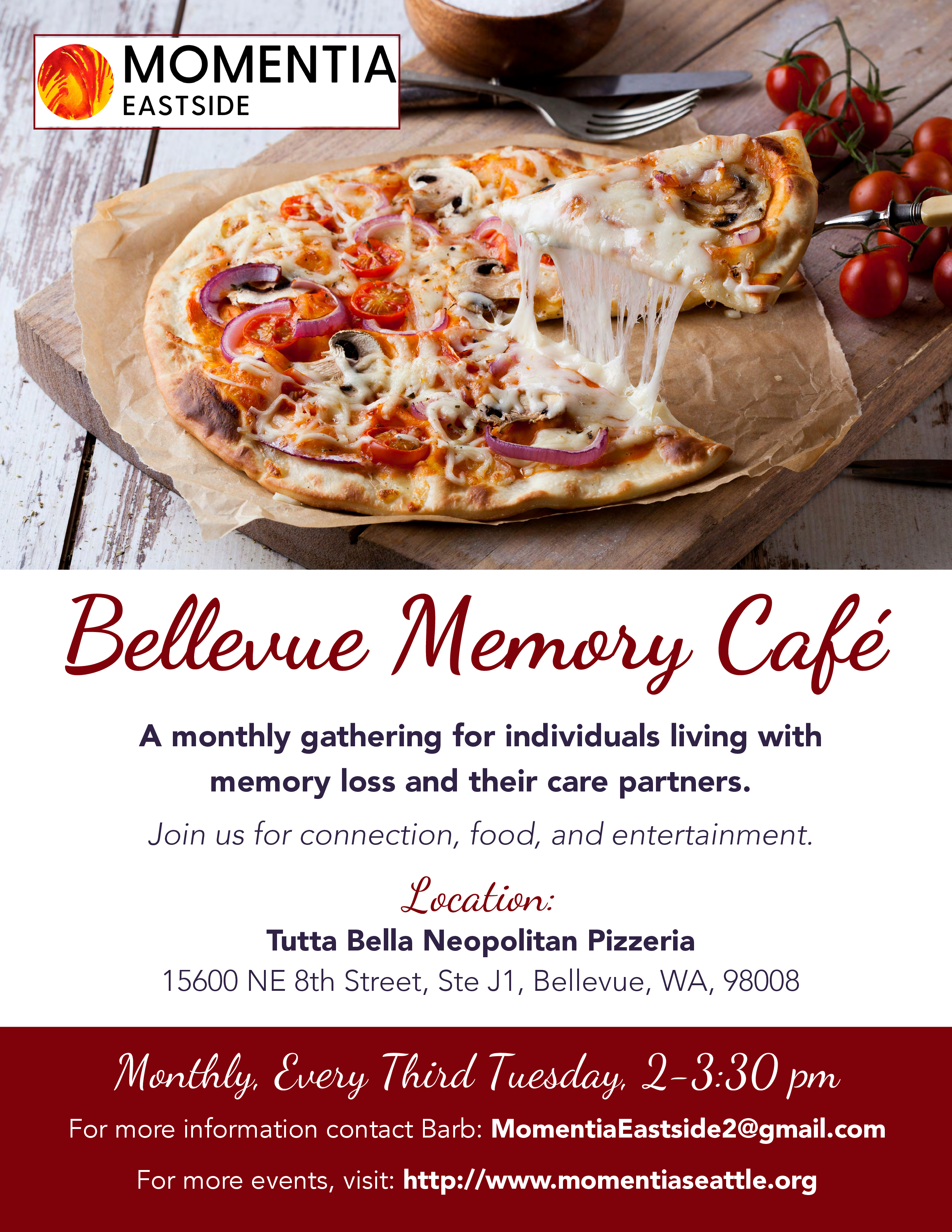 A monthly gathering for individuals living with memory loss and their care partners. Held every third Tuesday (starting March 19, 2024) from 2:00 - 3:30 PM Location is Tutta Bella Neapolitan Pizzeria, 15600 NE 8th St, Bellevue, WA 98008 Let us know if you're joining or if you have questions. Contact us by messaging hereMore