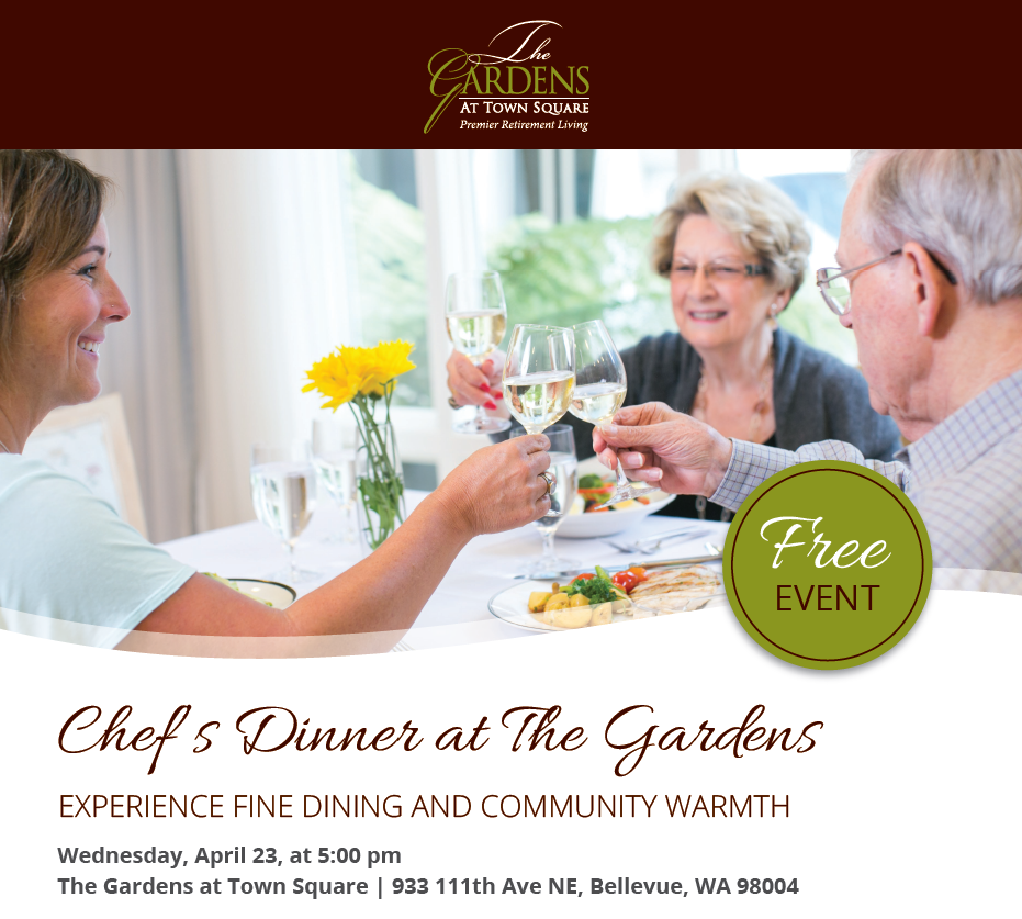 Join us for a special Chef’s Dinner at The Gardens at Town Square. Indulge in a multi-course gourmet meal crafted by our talented chef, Johnnie Williams, served in our stunning, light-filled dining room. Enjoy an evening of elegant dining and engaging conversation as you mingle with our wonderful residents. Attendance is limited to 25 people,More