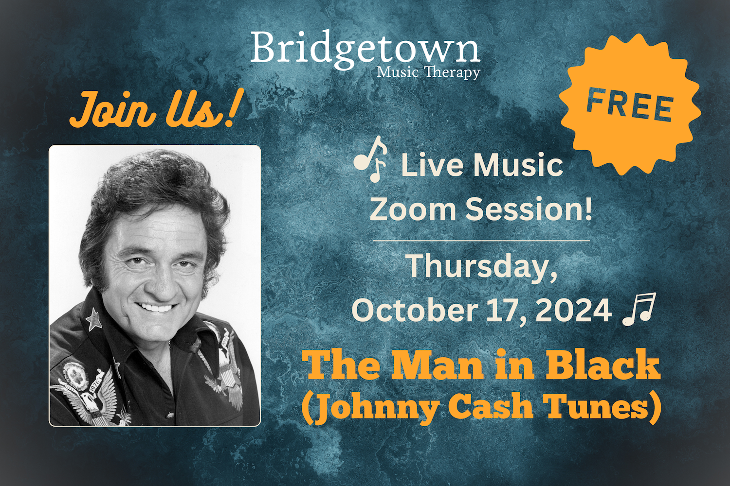 Free Live Music Activity for Older Adults! Enjoy an hour of lifelong learning, music, and fun! Join Bridgetown Music Therapy’s upcoming Live Music ZOOM Session: “The Man in Black (Johnny Cash Tunes)" Register TODAY: https://www.bridgetownmt.com/live-zoom-registration