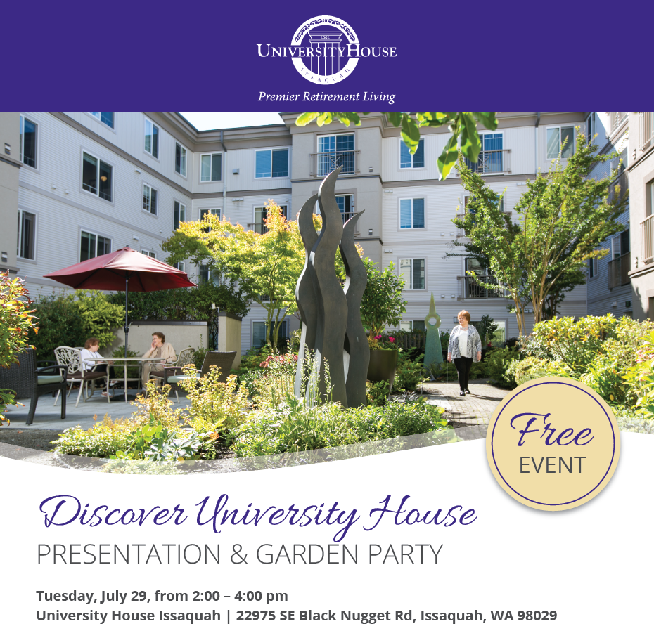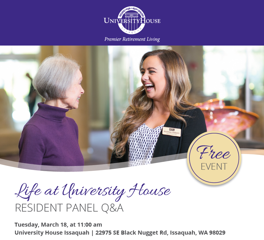 Come learn more about Life at University House Issaquah from a resident’s perspective! Join us for this lively Q&A with a panel of current resident who are happy to share their experiences with selecting and moving to University House. You’ll hear their thoughts on: what it’s like to let someone else do the cooking andMore