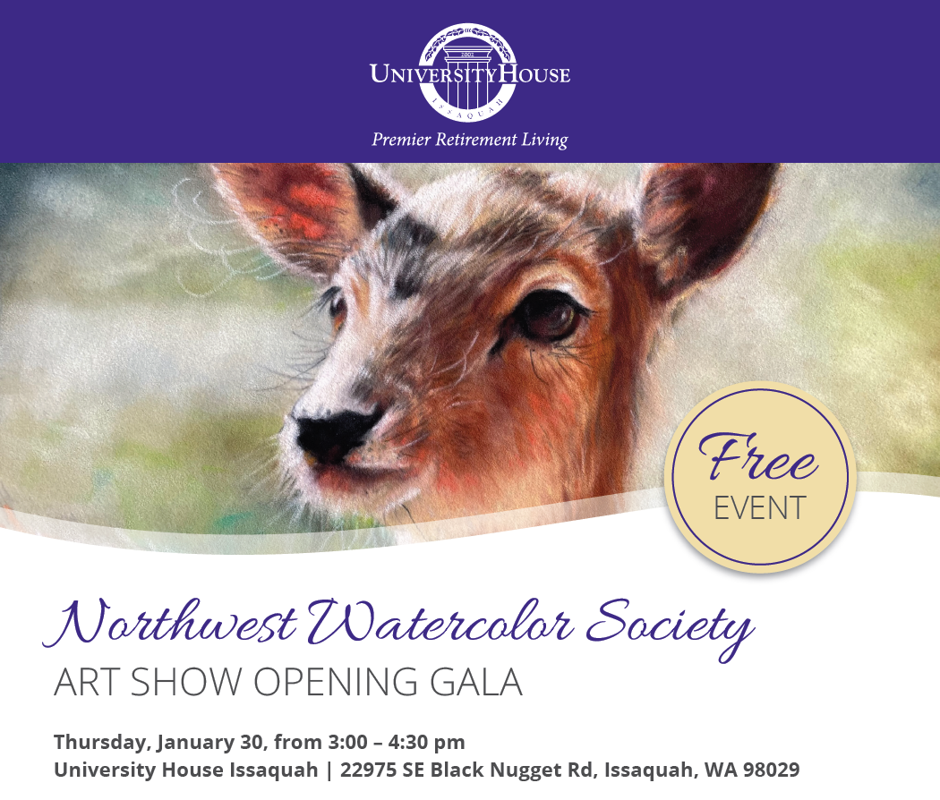 Please join us for the opening of our newest art exhibition. This show features a sample of work by members of the Northwest Watercolor Society. Watercolor painting is one of the oldest and more traditional art mediums. Fine art pure pigments are suspended in water, which gives way to a transparent or luminous effect. TheseMore