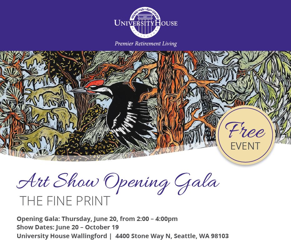 University House Wallingford 4400 Stone Way North, Seattle, WACome celebrate the opening of our newest art show, “The Fine Print,” a showcase of the art of printmaking in all its various forms from intaglio etching, linocut, woodblock, monotype, chine colle, letterpress, collagraphy, dry point, and mixed media. This show will be featuring artists locally and internationally, as well as University House Wallingford residentMore